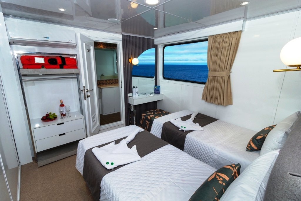 Todas las cabinas están equipadas con aire acondicionado, baño privado, espacio de almacenamiento y grandes ventanales con vistas al mar.