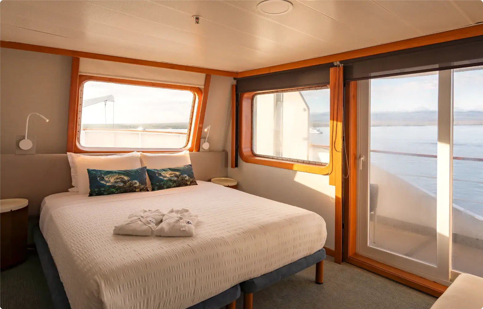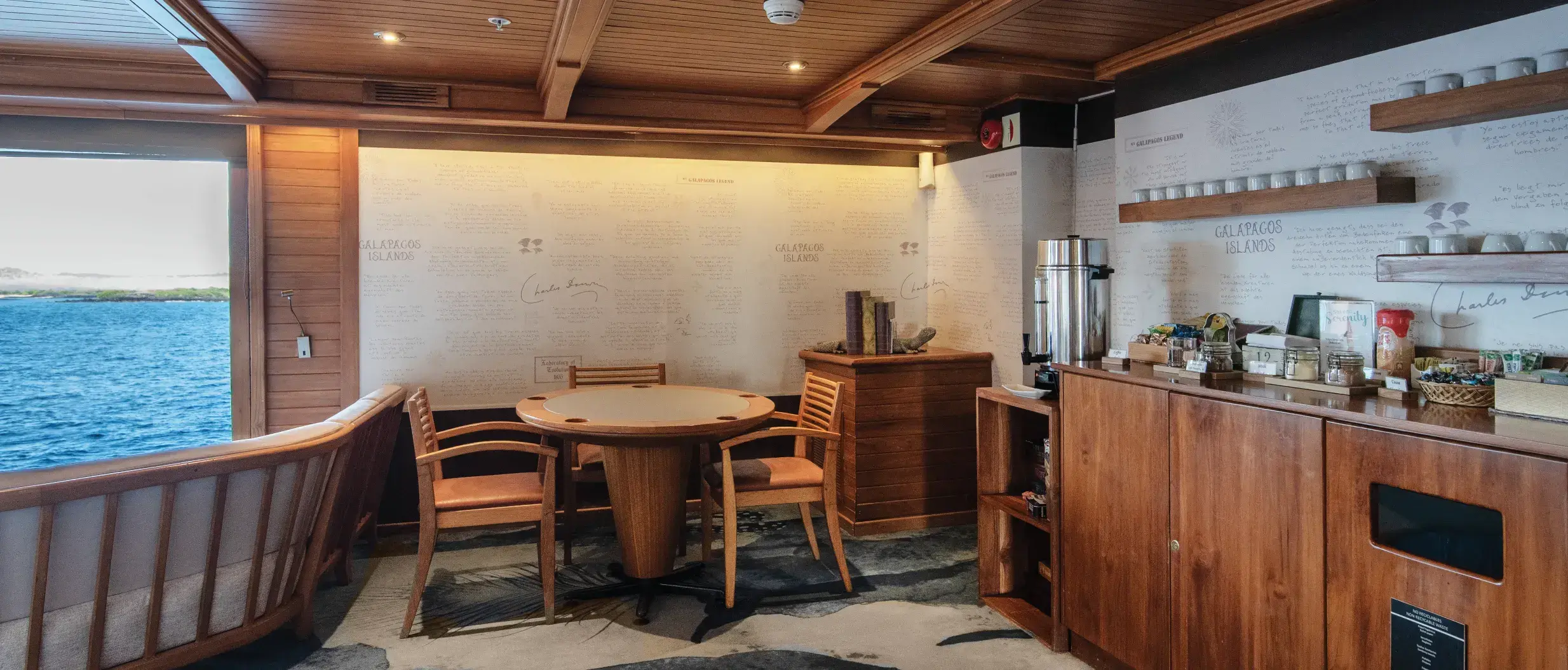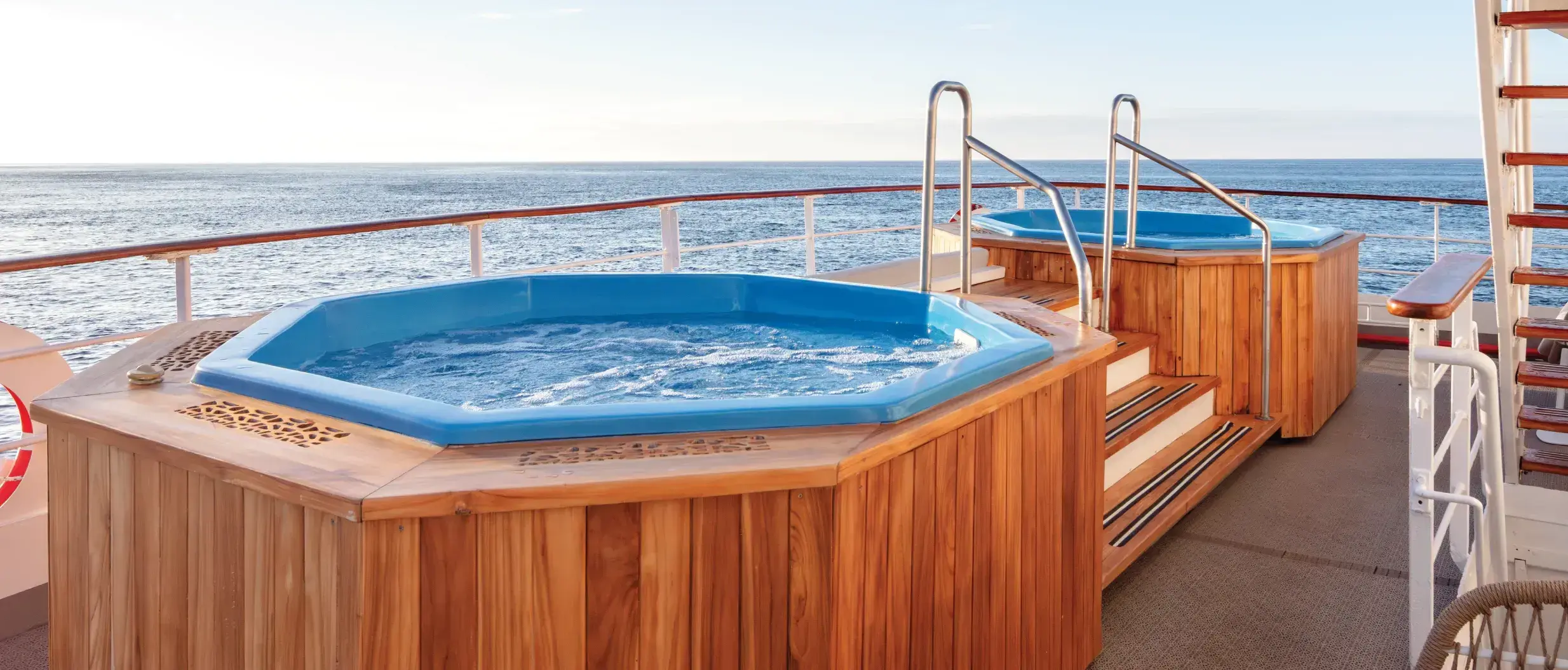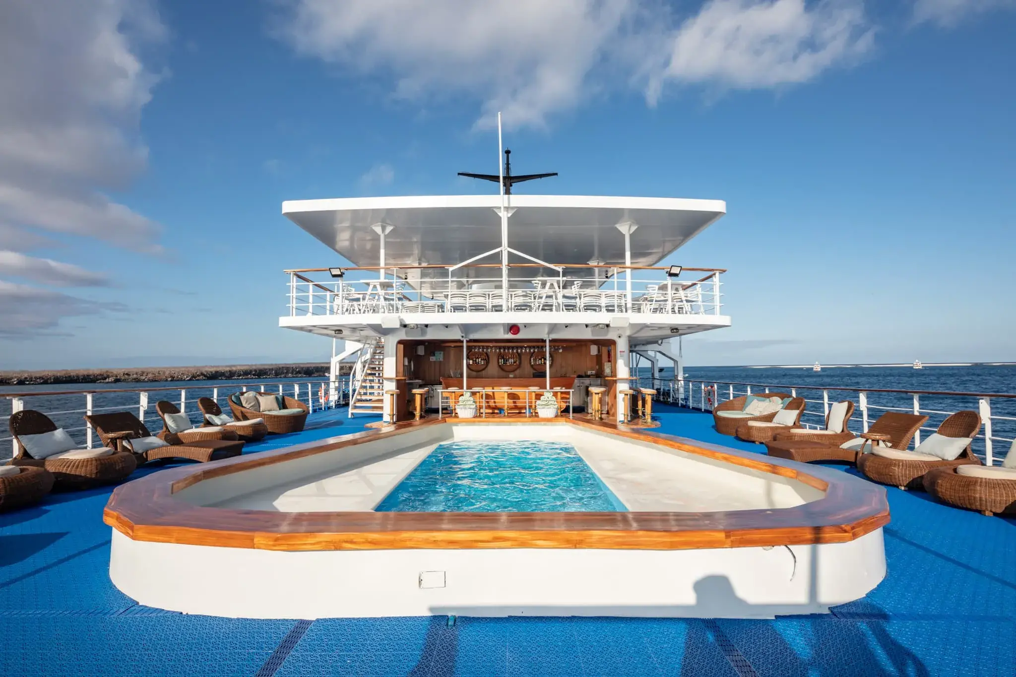 Las cubiertas son amplias y están equipadas con muchas comodidades, como el Fisherman’s Bar, un salón de música, un auditorio, una piscina exterior, una biblioteca, una boutique, una zona infantil, un jacuzzi, etc. Los pasajeros pueden utilizar kayaks con fondo de cristal y equipo de snorkel.