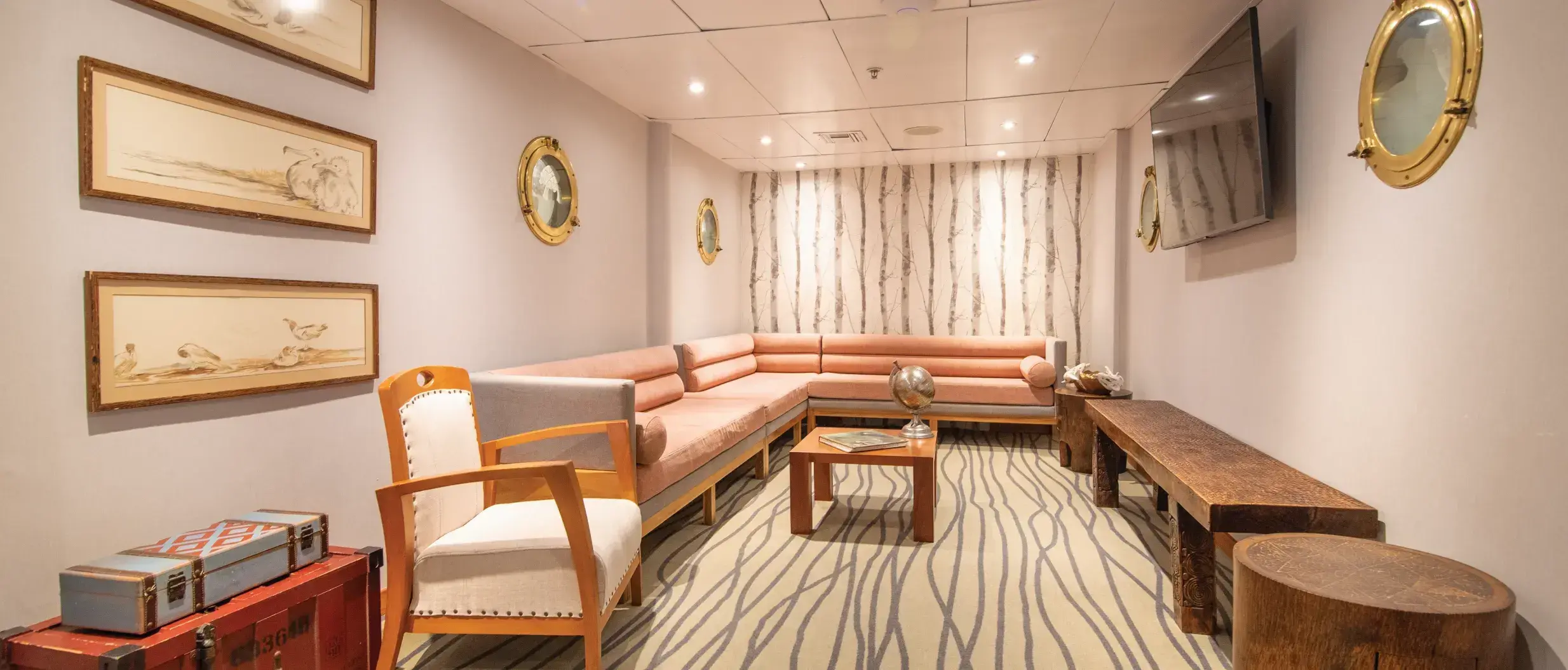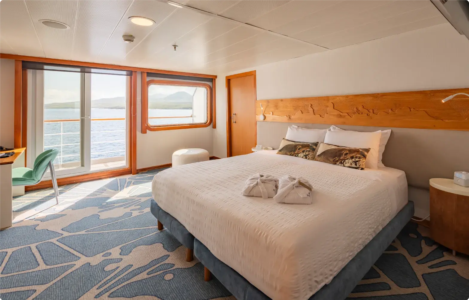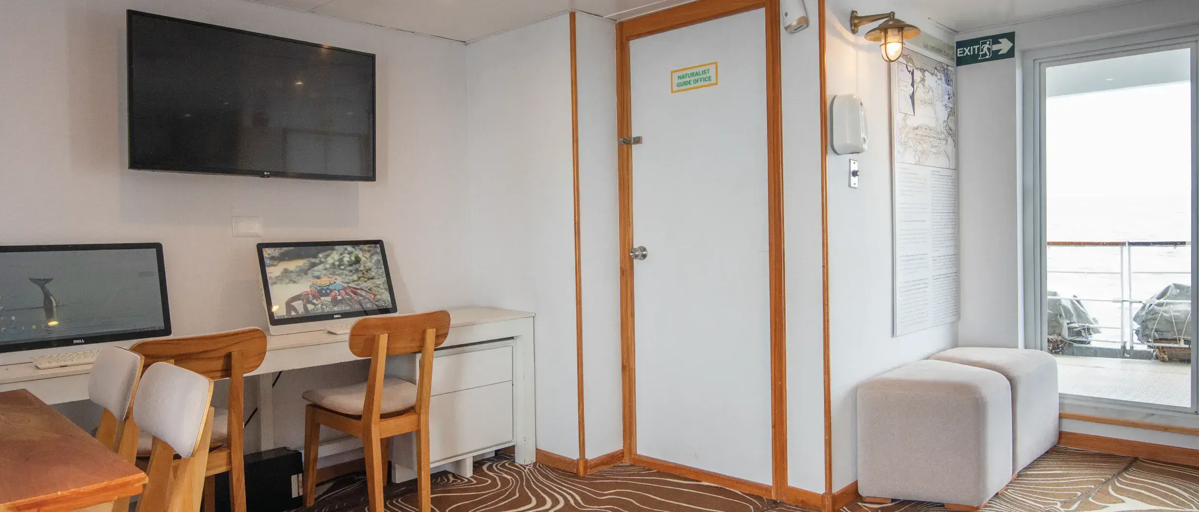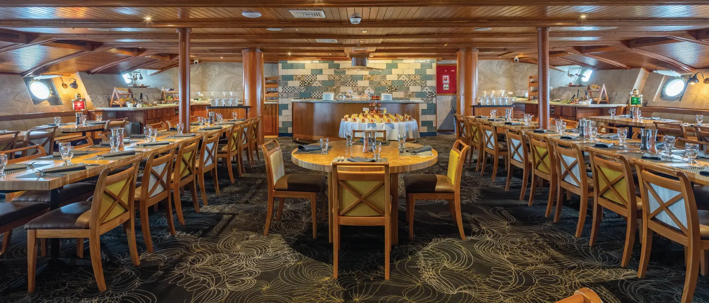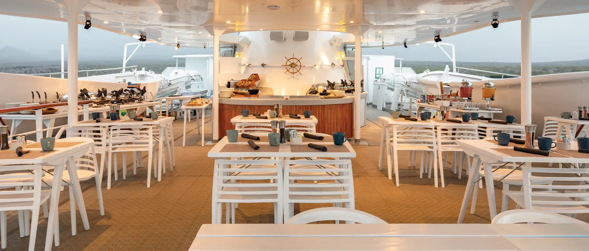 Las cubiertas son amplias y están equipadas con muchas comodidades, como el Fisherman’s Bar, un salón de música, un auditorio, una piscina exterior, una biblioteca, una boutique, una zona infantil, un jacuzzi, etc. Los pasajeros pueden utilizar kayaks con fondo de cristal y equipo de snorkel.